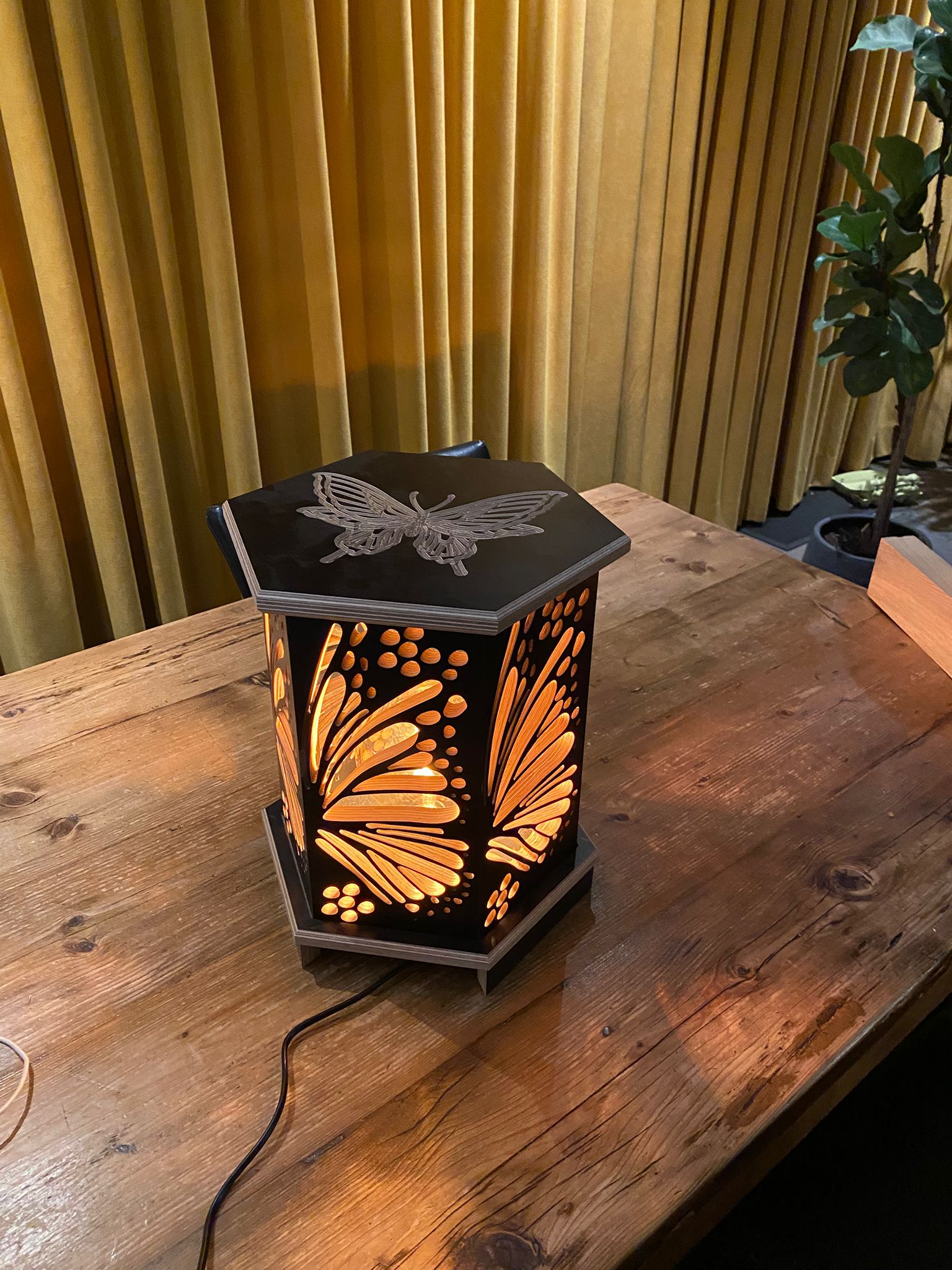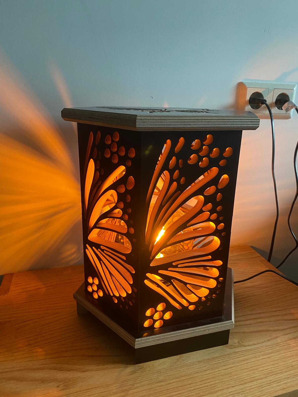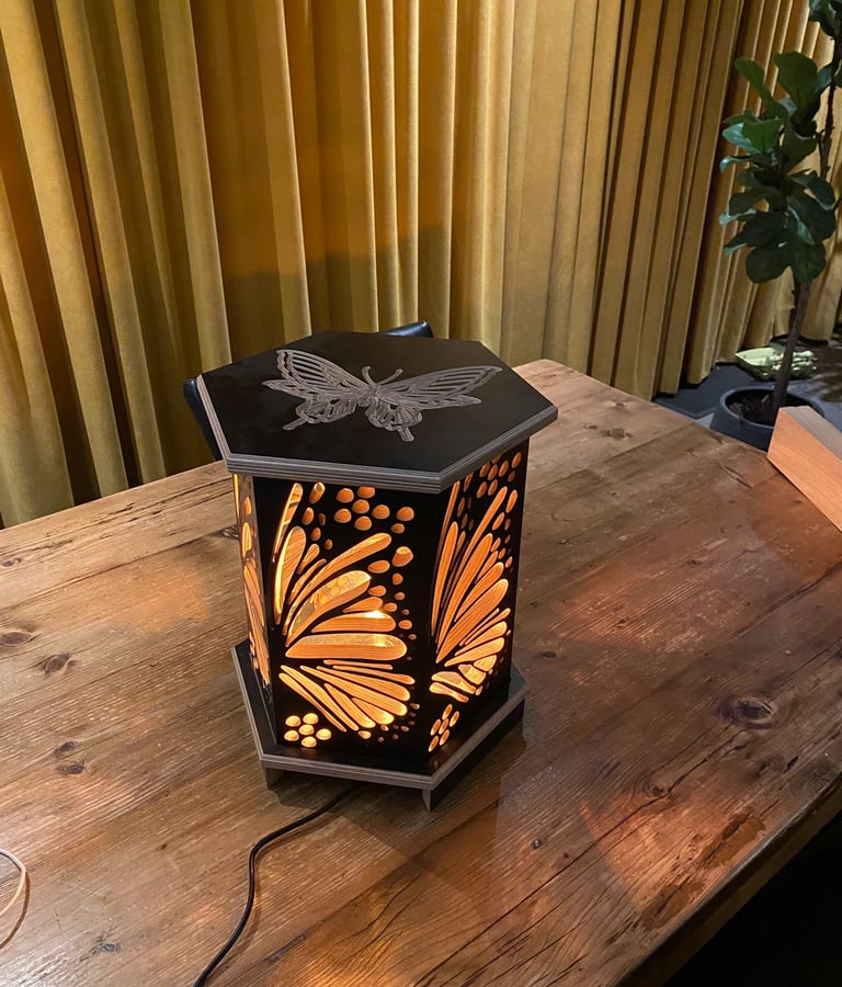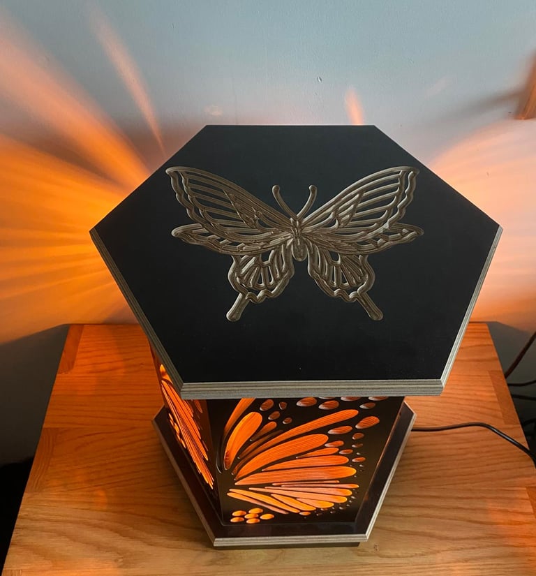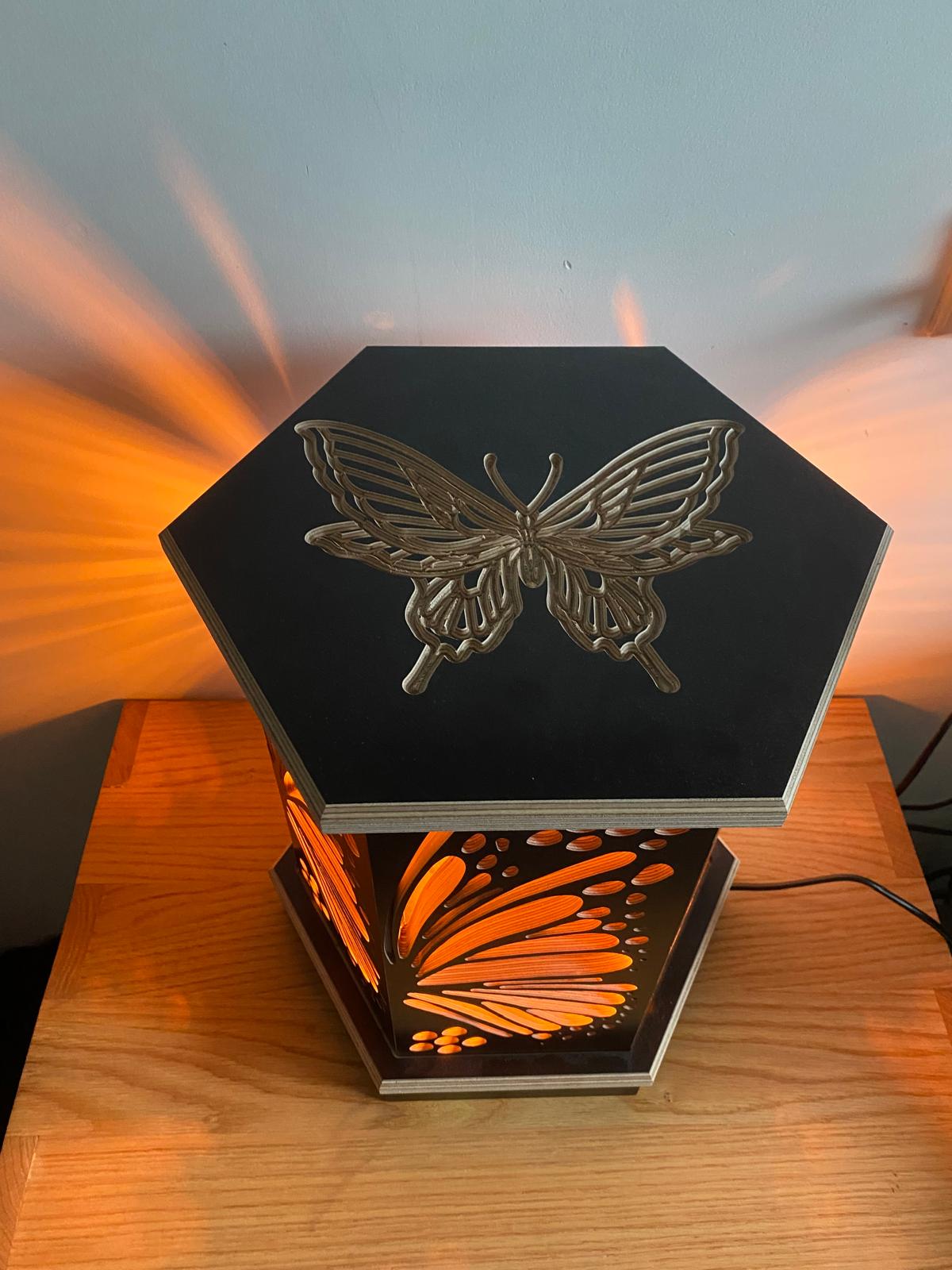 Deze lamp is gebaseerd op een hexagon, waar de vorm uit bestaat. Het patroon dat uit het hout is gefreesd is de binnenkant van een vlindervleugel.