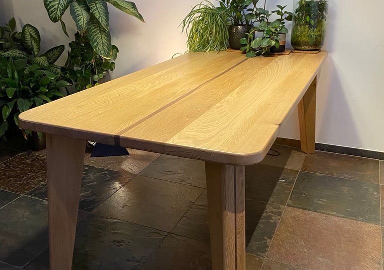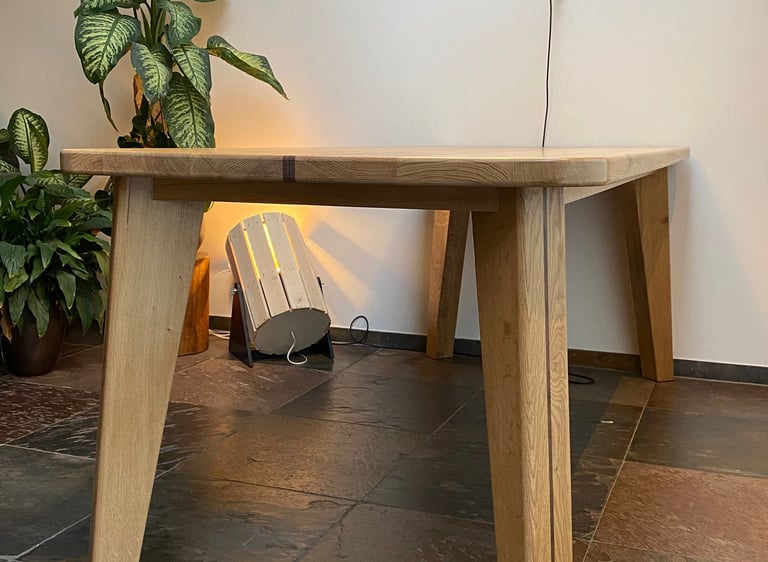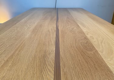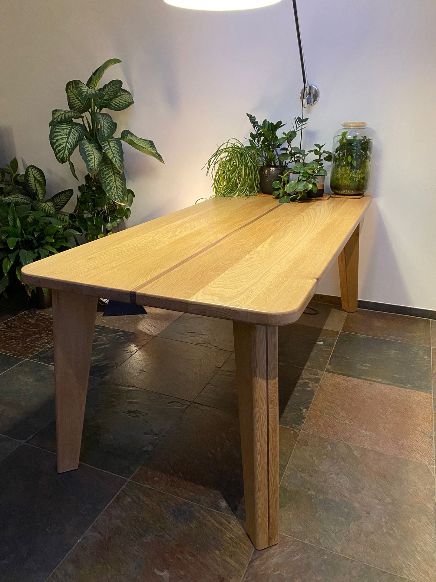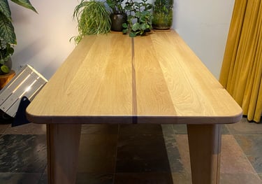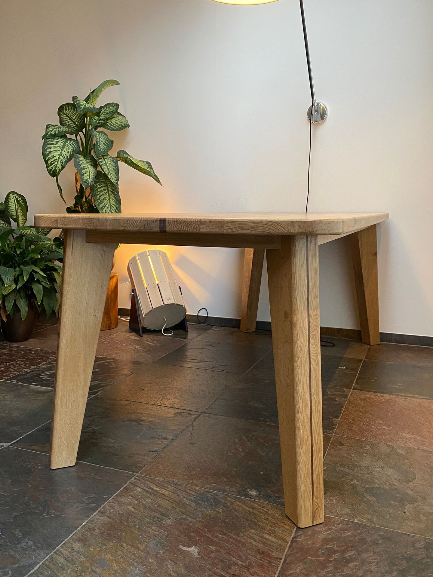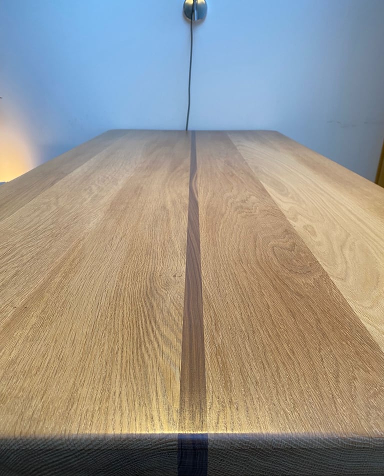 Een massief eikenhouten tafel met een subtiel accent van notenhout. Eigen ontwerp in opdracht.