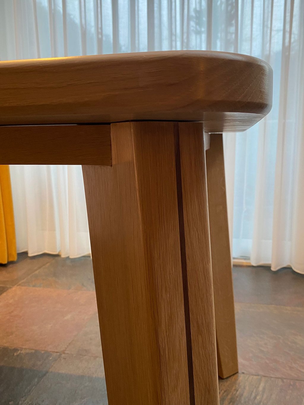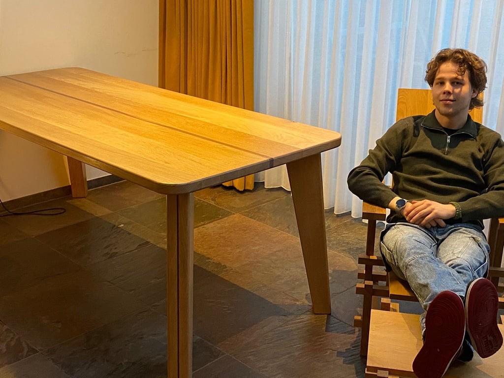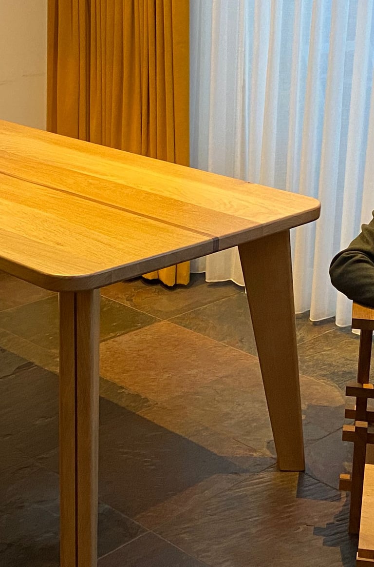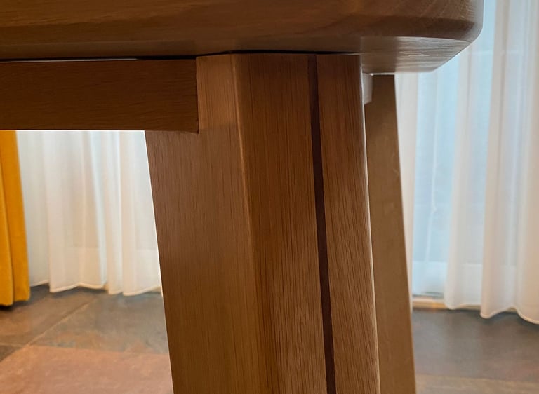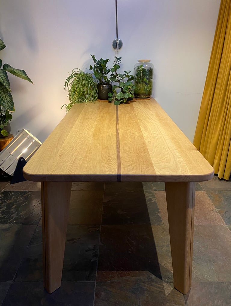 Een massief eikenhouten tafel met een subtiel accent van notenhout. Eigen ontwerp in opdracht.